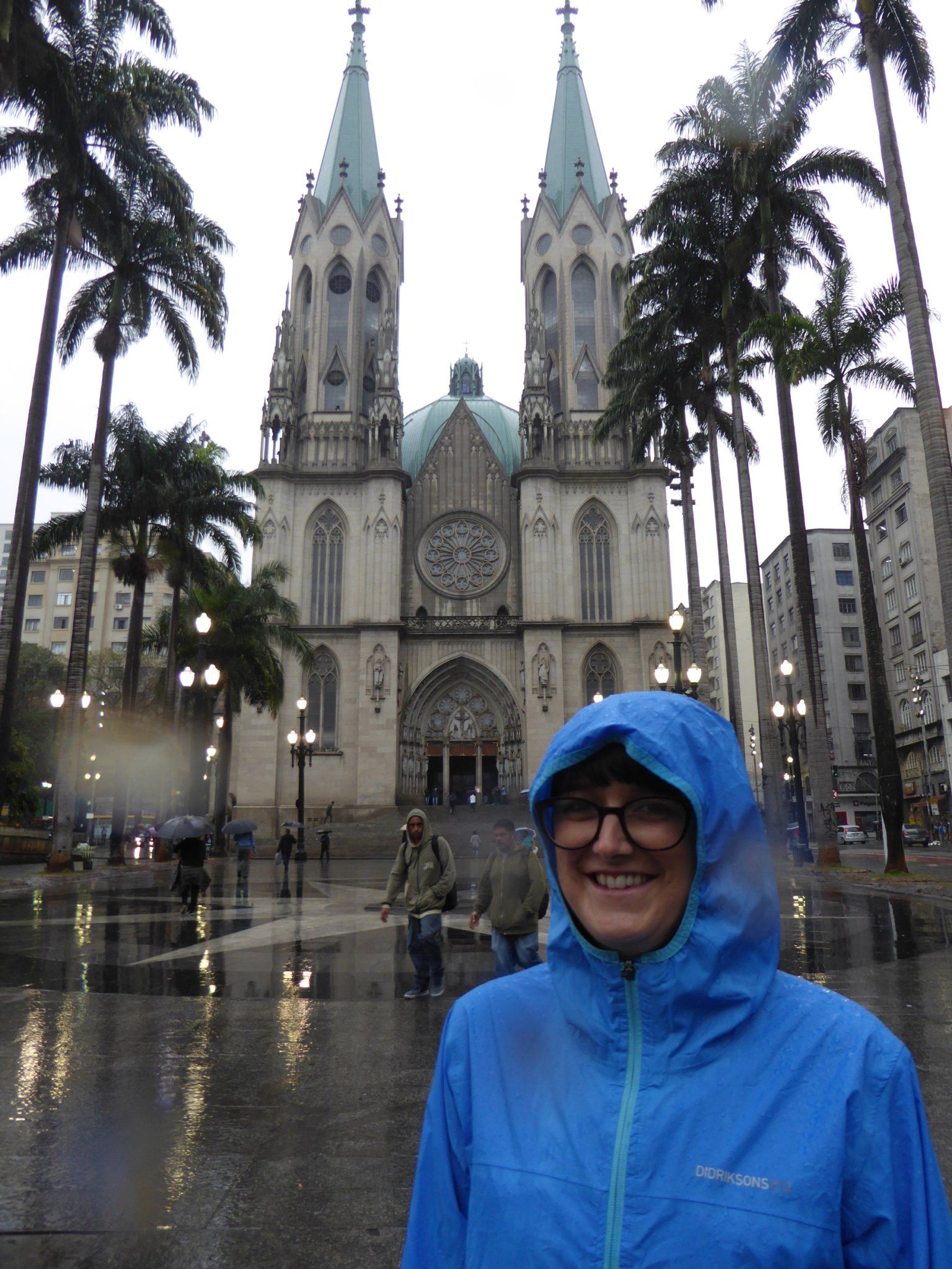 In our bathroom there was a sign asking us to be frugal with our water use, as São Paulo is currently facing a serious shortage, but this didn't seem to be the case on our first full day in the city, when it pissed down with rain for about 12 hours straight. The clouds hadn't looked too bad at breakfast time, so we decided to stick with our original plan and joined a free walking tour of the city's downtown area. However, it didn't take long for any lingering patches of blue sky to disappear, and we quickly pulled on our new waterproofs (originally purchased for the Inca Trail in November) as the heavens opened.